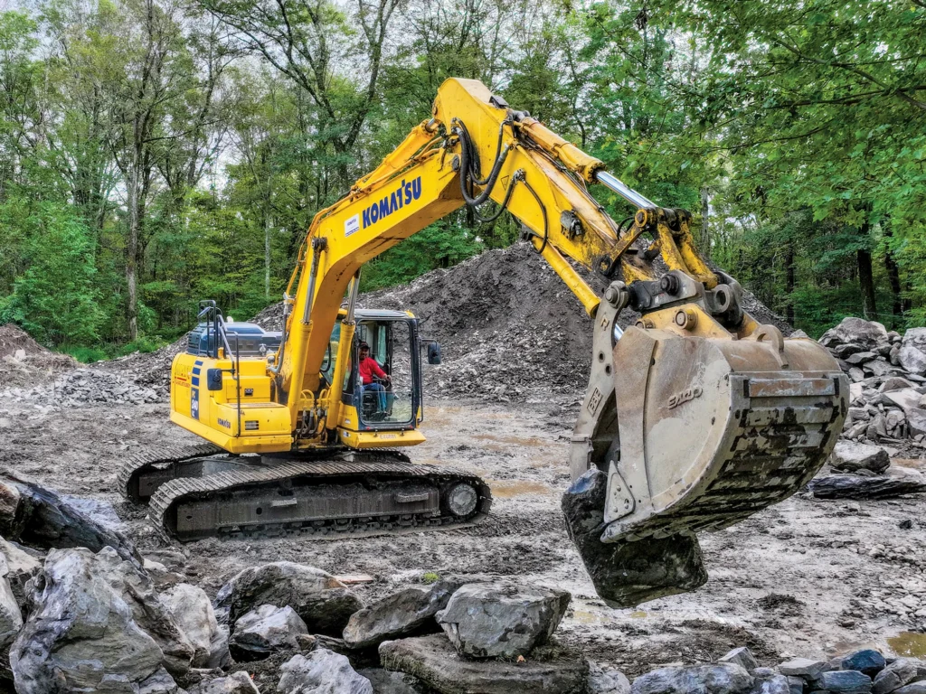 An operator uses a Komatsu PC240LC excavator to pile local rock at a staging site on an 800-acre maple syrup facility.